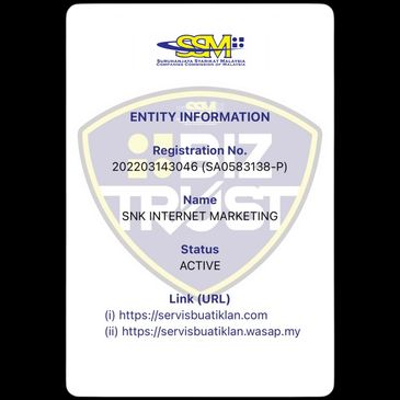 Kami mula menjual secara dalam talian sejak 2010 dan merupakan eUsahawan di bawah Malaysia Digital Economy Corporation (MDEC). Selepas tamat tempoh PKP, kami mendaftarkan semula perniagaan sebagai Snk Internet Marketing (SA0583138-P) bagi menepati kriteria SSM BizTrust, memastikan aktiviti pemasaran dan pengiklanan digital dijalankan secara sah dan profesional.